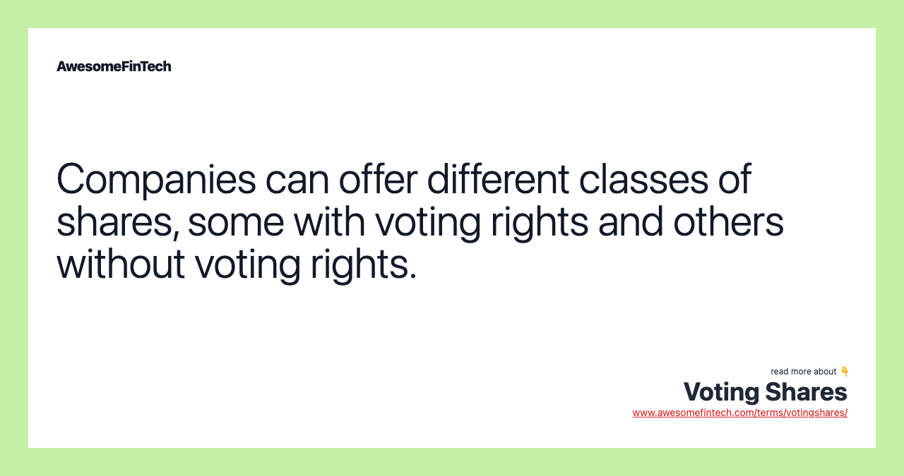 Voting shares are shares that give the stockholder the right to vote on matters of corporate policymaking. In most instances, a company's common stock represents voting shares. Different classes of shares, such as preferred stock, sometimes do not allow for voting rights.