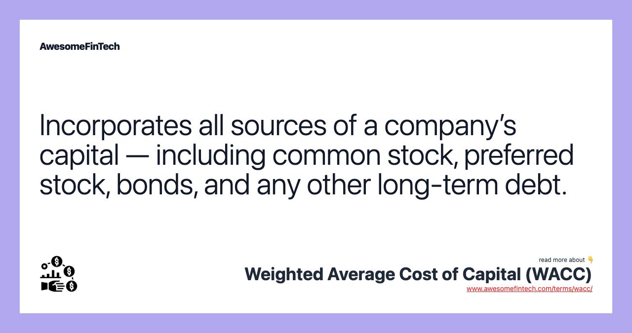 The weighted average cost of capital (WACC) is a calculation of a firm's cost of capital in which each category of capital is proportionately weighted. All sources of capital, including common stock, preferred stock, bonds, and any other long-term debt, are included in a WACC calculation.