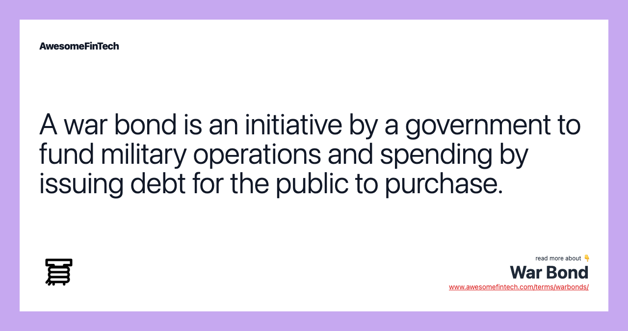 A war bond is a debt security issued by a government to finance military operations during times of war or conflict. Because war bonds offered a rate of return below the market rate, investment was achieved by making emotional appeals to patriotic citizens to lend the government money.