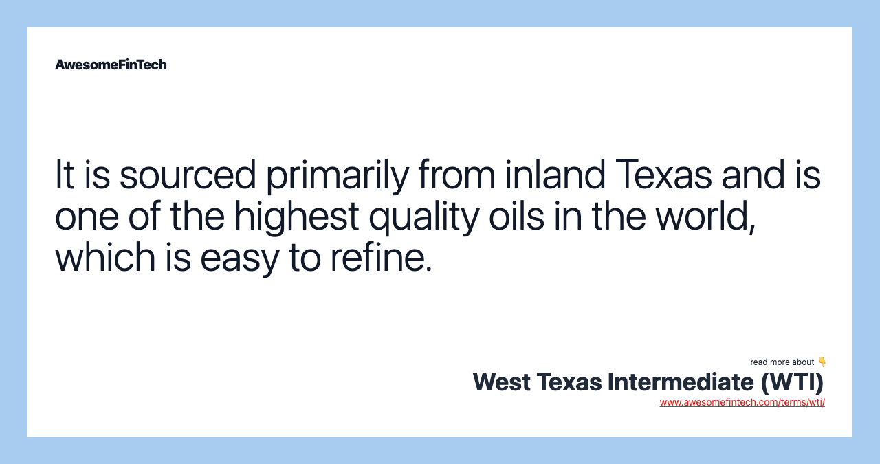 WTI is the underlying commodity of the New York Mercantile Exchange's (NYMEX) oil futures contract and is considered a high-quality oil that is easily refined.